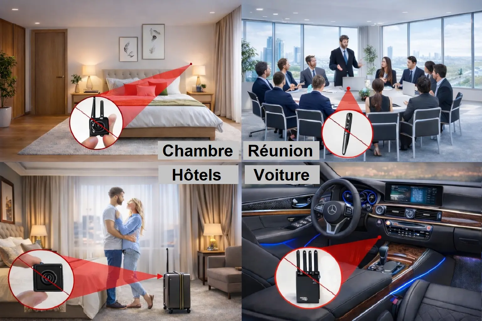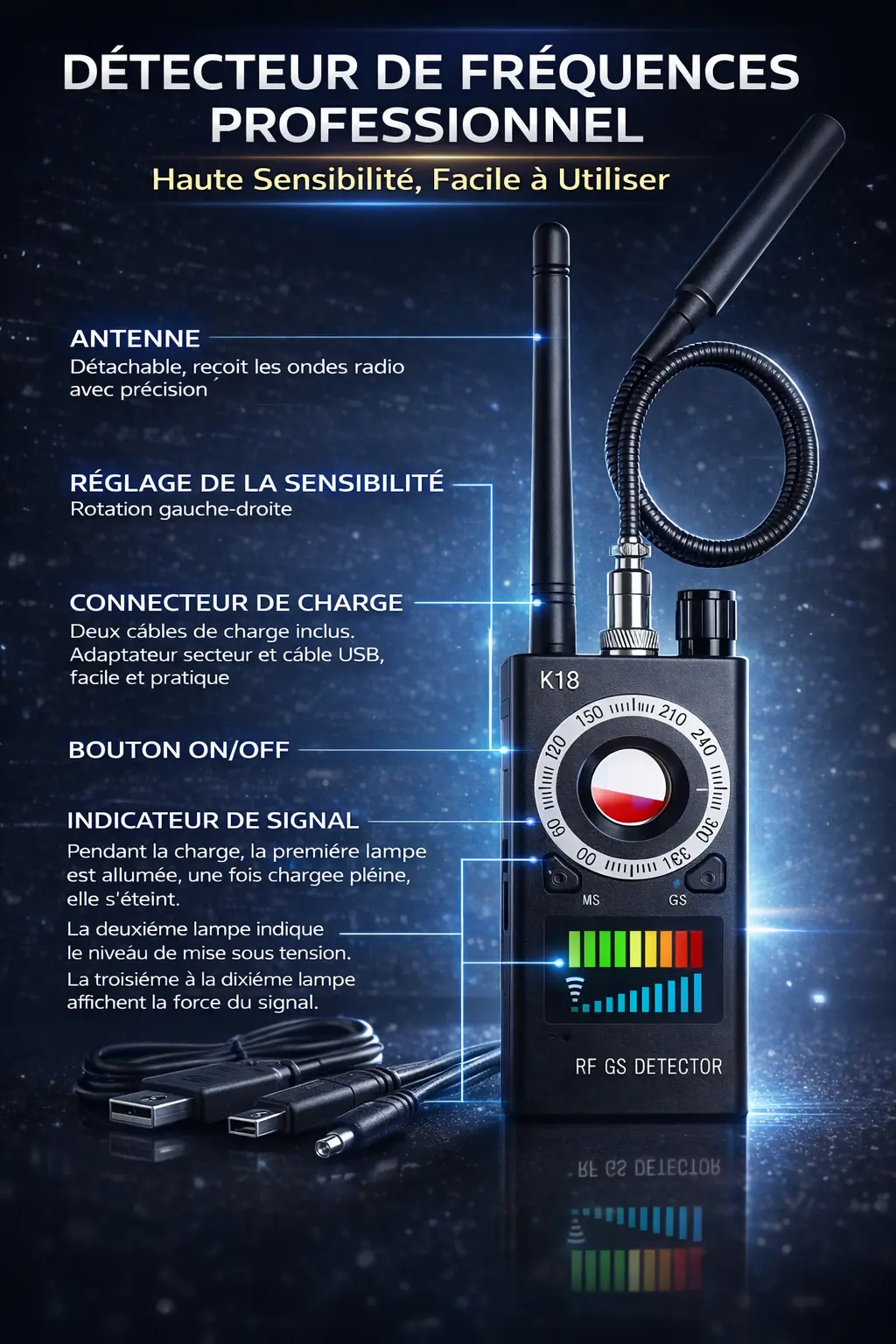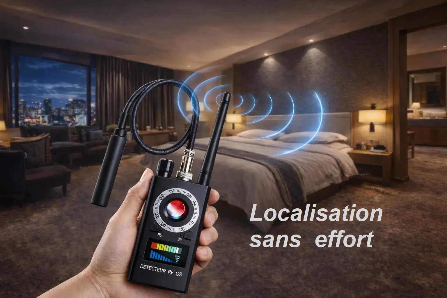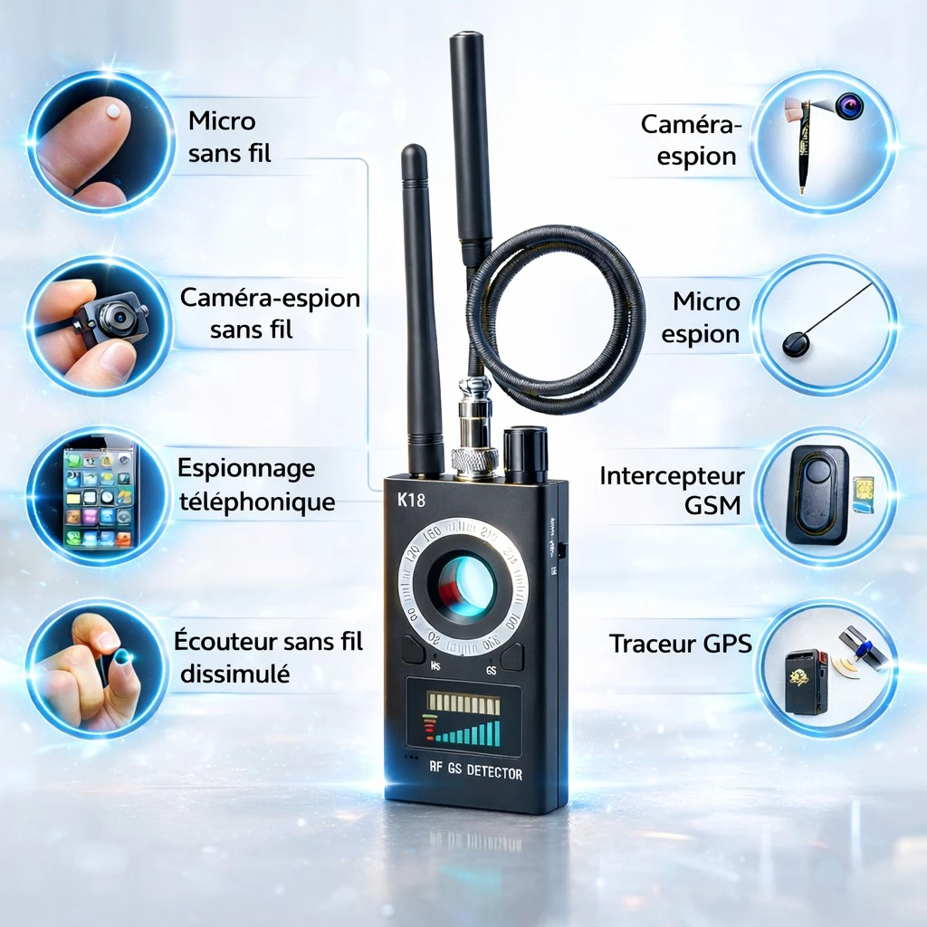 Repérez facilement caméras cachées, micros espions, traceurs GPS et transmissions sans fil grâce à un détecteur compact, précis et simple d’utilisation.